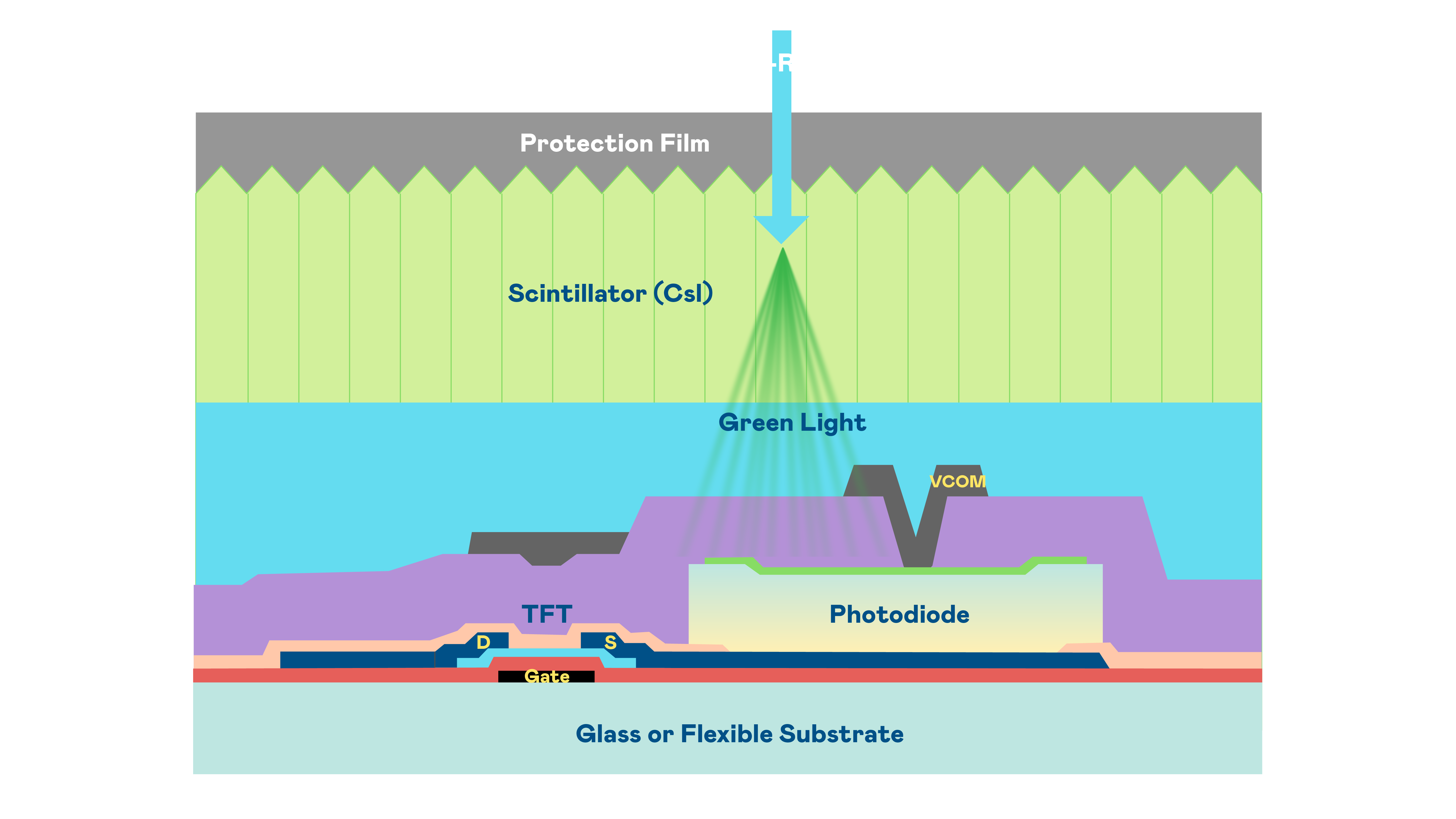太阳集团城娱8722的X光影像感测阵列使用薄膜电晶体 (TFT) 作为每个像素的读取开关,搭配光电二极体(Photodiode)的光电转换元件,用以感测X光影像讯号。